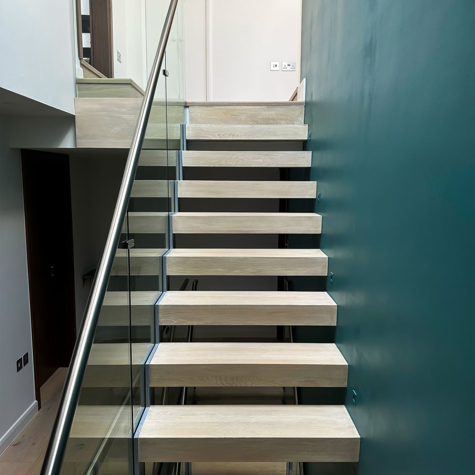 Discover a brand new installation that will leave you amazed. This zig zag staircase features natural oak steps, a glass balustrade, and a sturdy steel handrail for a sleek and secure design. At the beginning of the staircase, you'll find unique pyramid steps that add a touch of artistic charm. It's a stunning addition to this contemporary home, sure to impress all who encounter it.